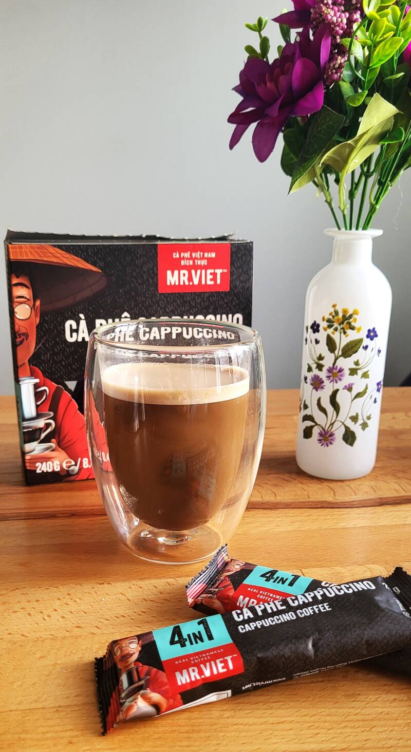 Mr.Viet Cappuccino on kermaisen herkullinen ja täyteläinen instant kahvi jossa on lisättynä sokeri, maito- ja kermajauhe.